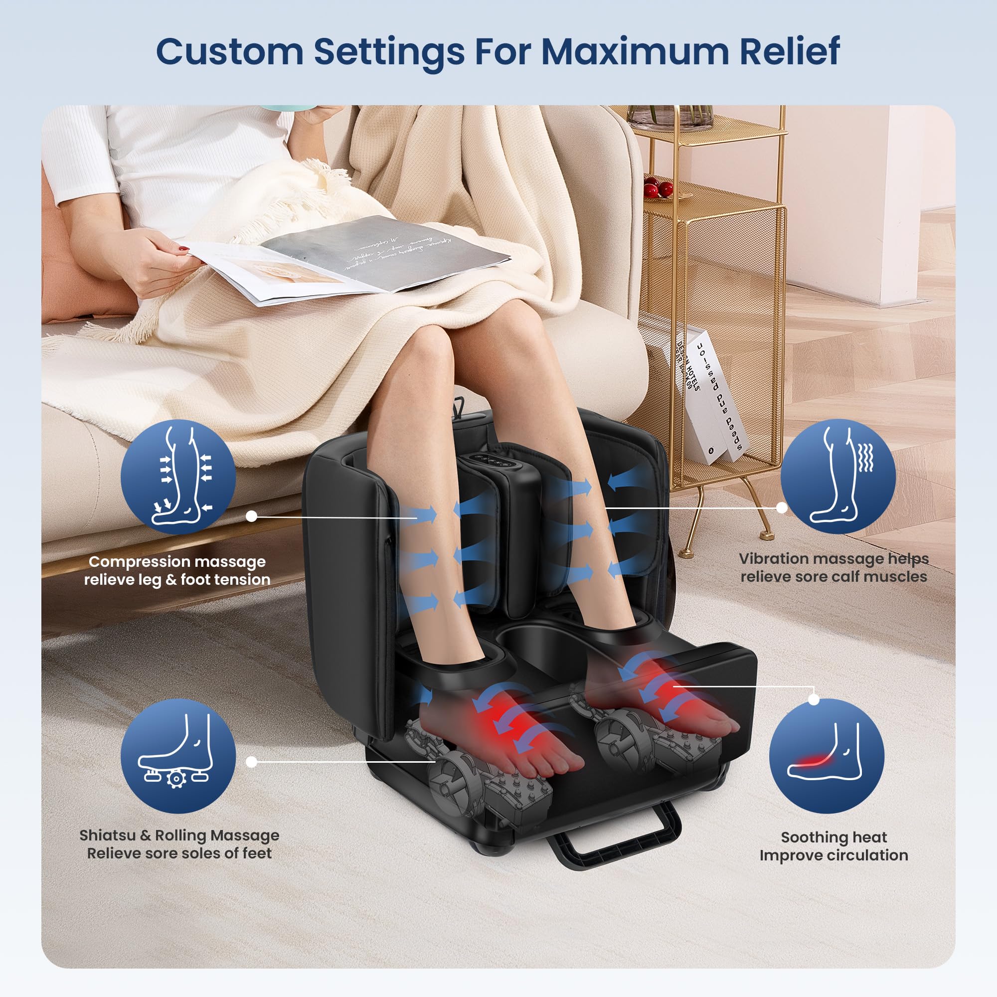 - Massage Feet, Ankles & Calves,relax whole body, Comfier HSA feet massager machine comes with shiatsu, compression, vibration and heat functions provide you with an optimal comprehensive massage experiences.(Recommended for calves with a circumference between 32–42 cm)
