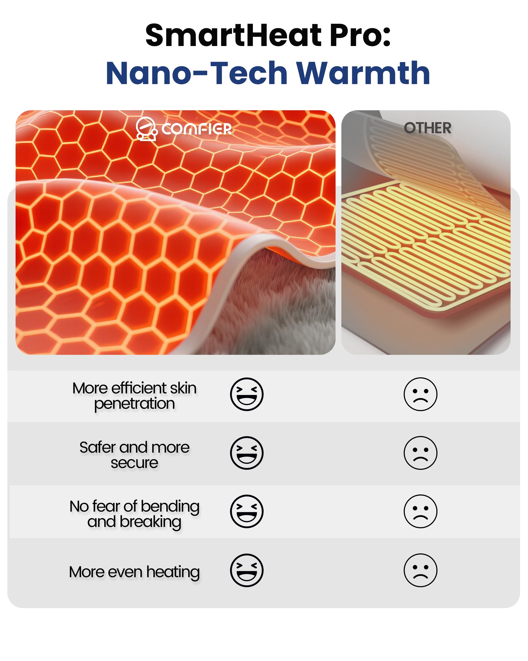 - Heating Pad with Massager & Efficient Warmth, Triple Control:COMFIER heating pad for back pain adopts new heating film technology, heating more evenly, quickly covering a large area, so that the warmth of a safer touch.COMFIER electric heating pad is designed with three levels of temperature adjustment to meet individual needs (After pressing the power button to turn on, press the MODE button three times to turn off the vibration function.), whether it's for light pampering or deep warmth, it brings unparalleled comfort.Please note: This heating pad is designed for wired use and must be plugged in during operation. It is not cordless.